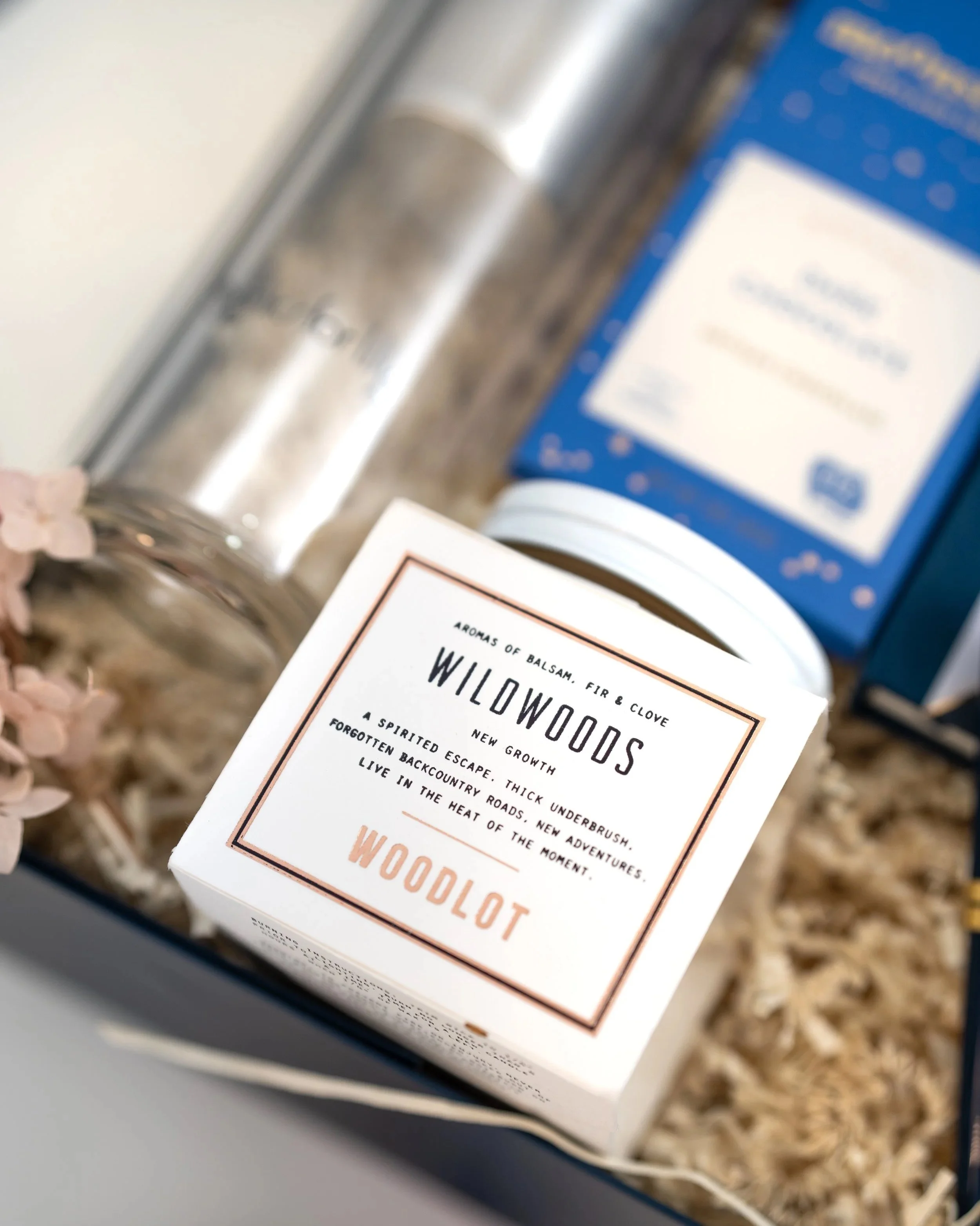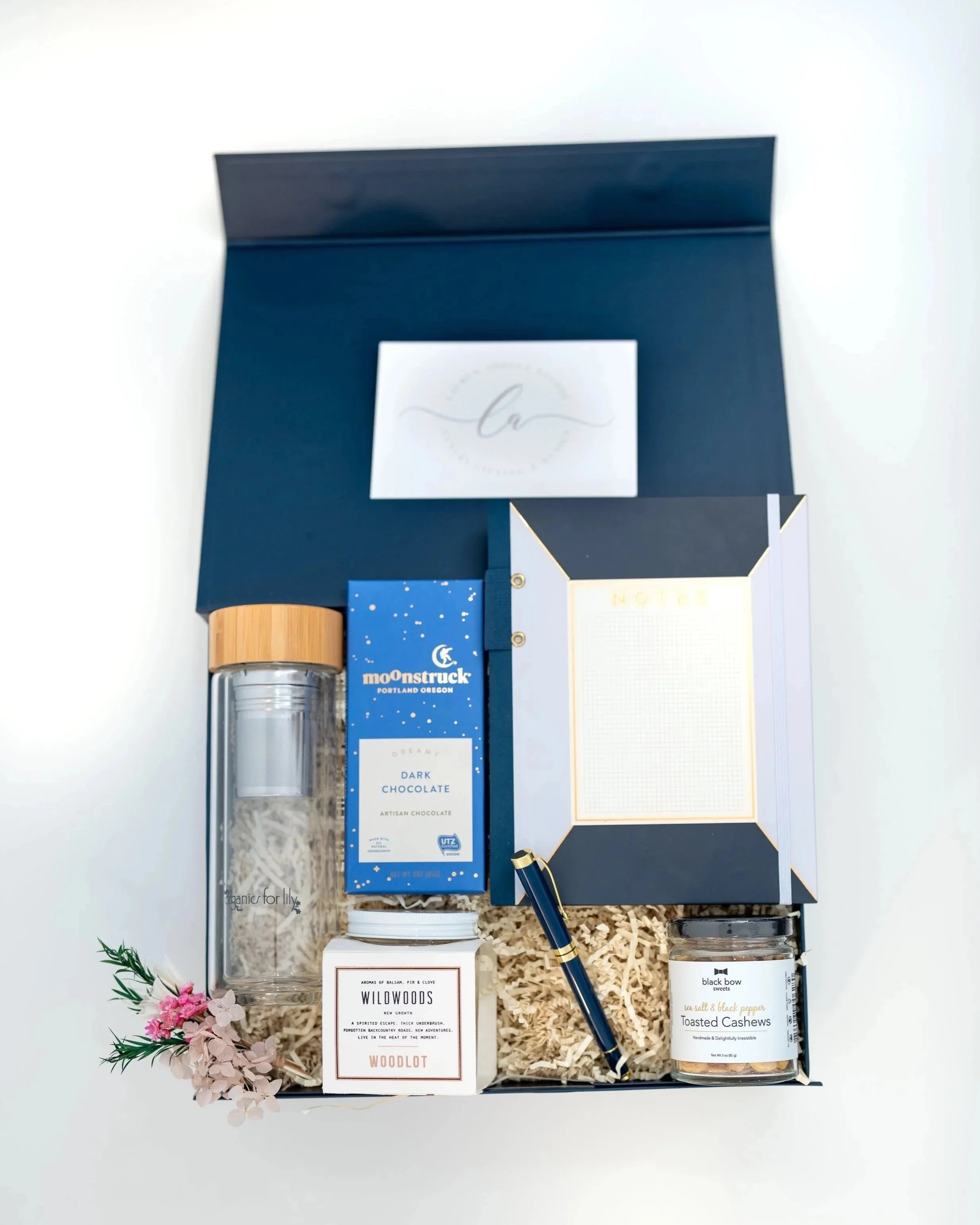 Client welcome gift boxes may include items such as journals, pens, candles, artisan chocolate, premium snacks, tea accessories, drinkware, and branded inserts. These details help the gift feel warm and elevated while still remaining professional.